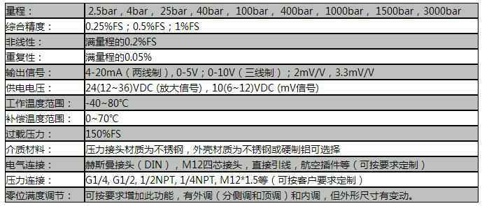 额定量程:0…0.2bar 到0…3000bar压力范围的测量