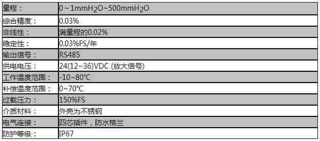 额定量程:0~1mmH2O, 0~500mmH2O